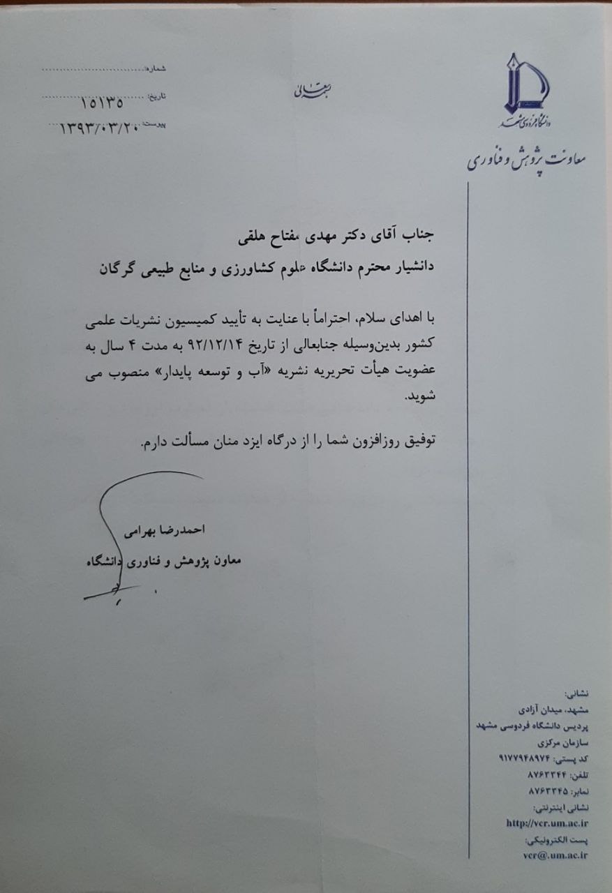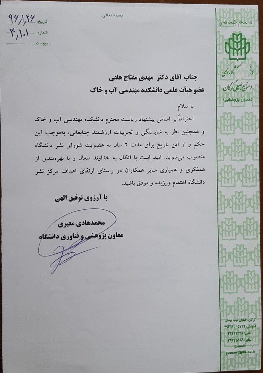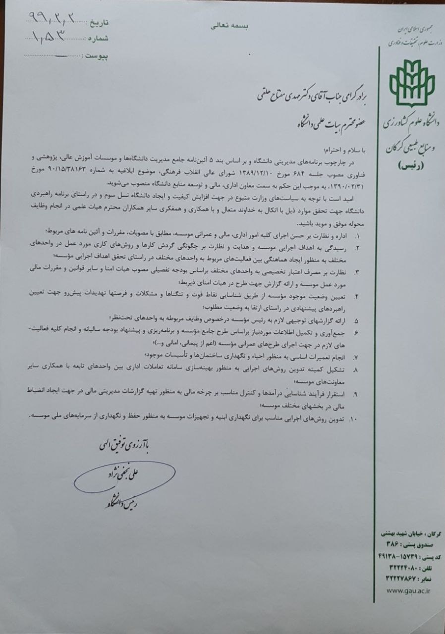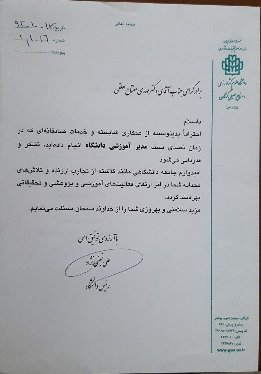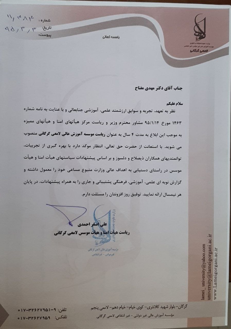 – ریاست موسسه آموزش عالی لامعی گرگانی از 1/10/1393 تا 29/4/1398